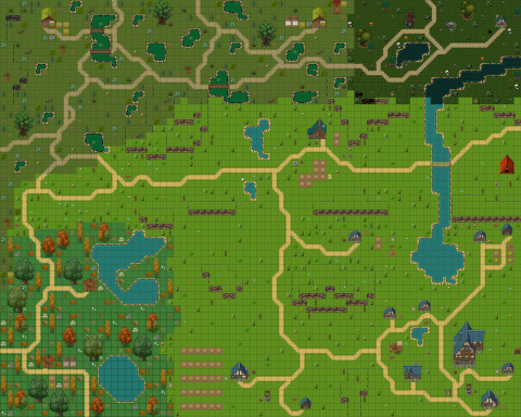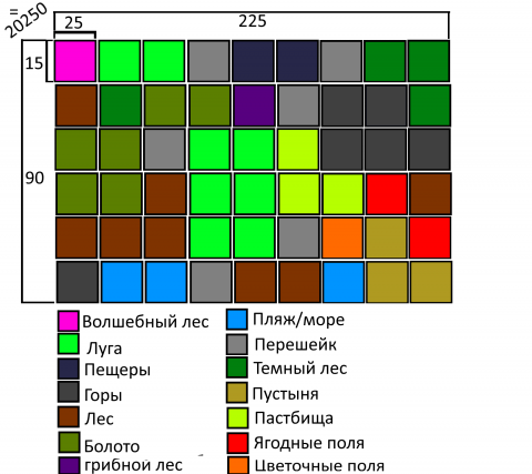 Помниться мне была написанная мной фраза иду к бесшовному миру. Ну так вот. Тогда эта задумка казалось нереальной в том смысле что такую тайловую карту будет довольно-таки долго делать, если заполнять её вручную. Но сейчас, когда я немного поправил код утилиты для рисовки, так скажем, тайловой карты, идея не кажется столь бизумной. Бесспорно ещё остались некие проблемы с этим, но они столь не значительны что решить их будет просто. Но все. С уверенностью хочу сказать, что мир не будет поделен на такие маленькие локации как было. (хоть и 1.2к явно не мало для qsp особенно с той HTML вёрсткой что у меня присутствует, но хочется чтобы все было бесшовно. А это значит что будет одно большое поле. Чуть более чем в 16 раз превышающее размер прошлых локаций) Если все такие идея с бесшовным миром прогорит, то как минимум он будет поделен на 2-4 зоны. Расположение биомов пока намечено вот таким.
