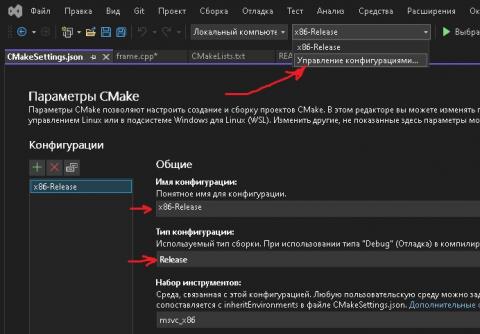 4. После открытия проекта нужно изменить настройки сборки - это то как будет собран проект. Изначально если не чего не менять то будет установлен x64-Debag. Нужно выбрать - Управления конфигурациями - и создать новые параметры.