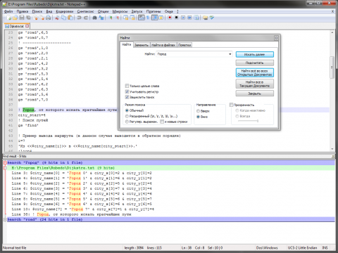 И кроме того есть окно, в которое можно вывести все найденые строчки, по всем открытым файлам.