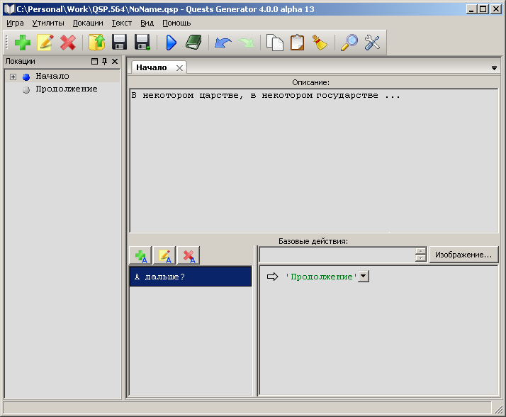 В “конфигурации новичка” видны окошки и кнопочки для написания простейшего квеста без переменных и условий, такие как “Базовое описание”, “Базовые действия” и вероятно кнопка для добавления нового действия. При добавлении нового действия вызывается диалог с выбором локации на которую выполняется переход.